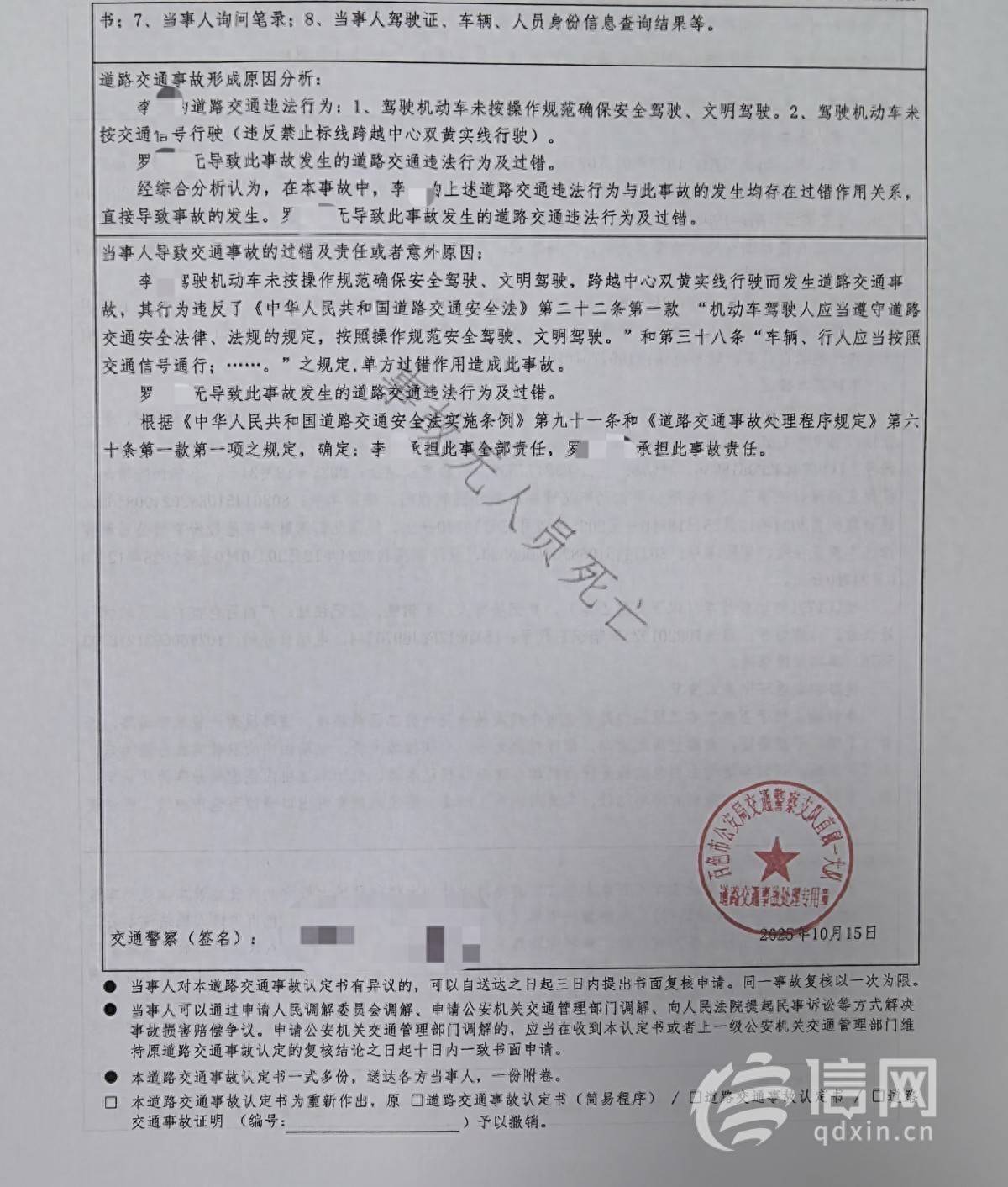 信网/信号新闻10月24日讯此前,信号新闻(0532-80889431)报道了百色市民罗先生因避让法院警车摔倒致骨折一事(详见报道《百色一男子避让法院警车摔骨折:警车未亮警灯跨双黄线、责任认定待查》)。10月15日,百色市公安局交通警察支队直属一大队出具道路交通事故认定书,明确涉事法院警车驾驶员李某承担事故全部责任,伤者罗先生无责。